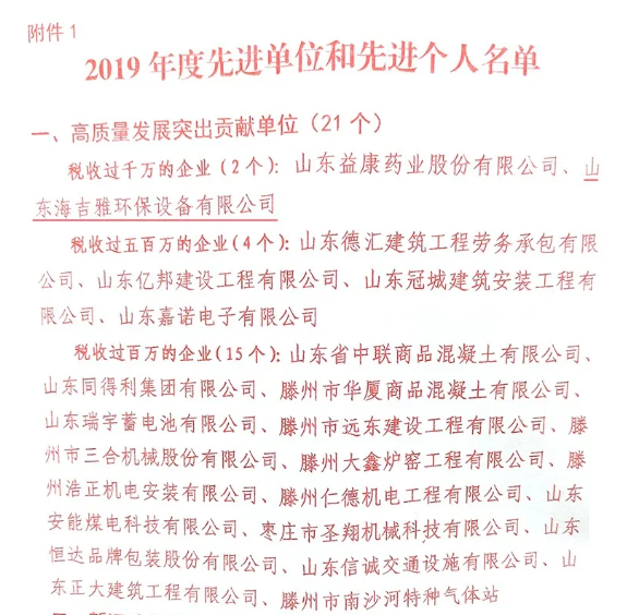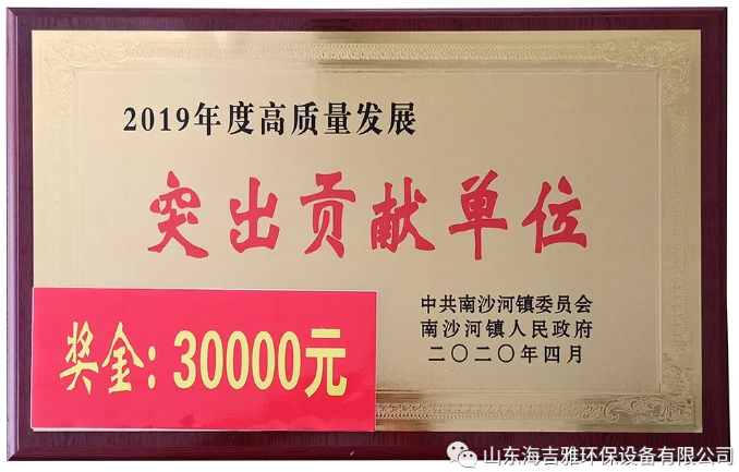 2019年度海吉雅環保實現稅收一千五百余萬元為南沙河鎮經濟發展做出了重要貢獻,榮獲“高質量發展突出貢獻單位”稱號。
