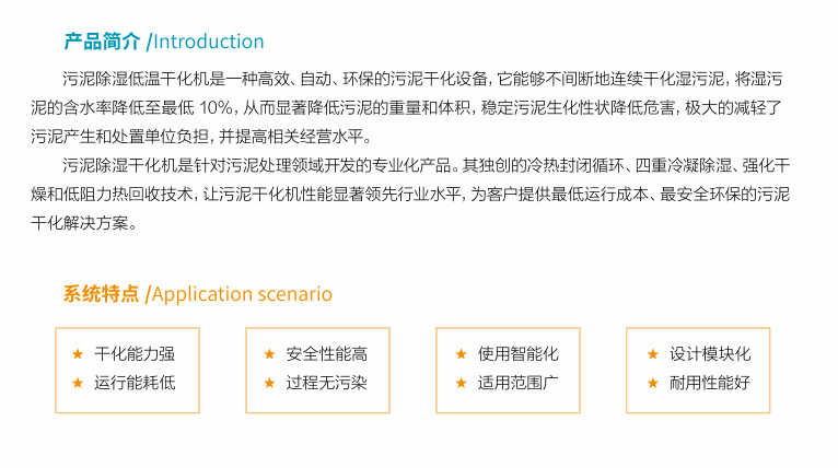 污泥除濕干化機是針對污泥處理領域開發的專業化產品。其獨創的冷熱封閉循環、四重冷凝除濕、強化干燥和低阻力熱回收技術,讓污泥干化機性能顯著領先行業水平,為客戶提供最低運行成本、最安全環保的污泥干化解決方案。